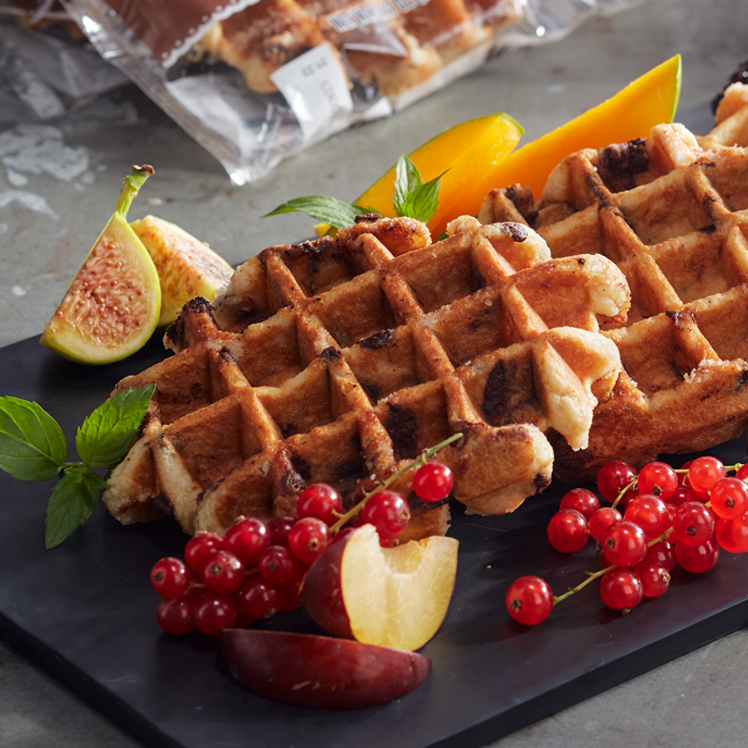 Diners have spoken: They love our Devonshire® Premium Belgian Waffle. So rather than mess with a good thing, we did the only thing that could make it better: we added chocolate. This new version offers the same authentic waffle profile – made in Belgium, featuring crunchy sugar pearls – but now features bits of Belgian chocolate chips. Individually wrapped, it's perfect for grab-and-go, family-style meals, hospitality or a quick-serve breakfast or dessert item from your menu. Just thaw and serve, or warm/toast for the perfect finish.